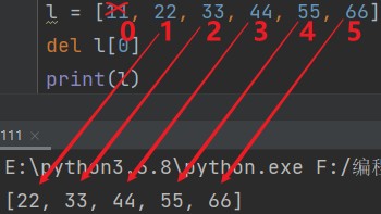 del 列表[序号] eg: del l[0] # [22, 33, 44, 55, 66]