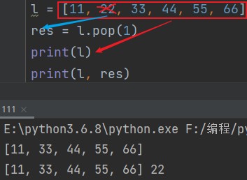 列表.pop(序号) eg: res = l.pop(1) print(l, res) # [11, 33, 44, 55, 66] 22