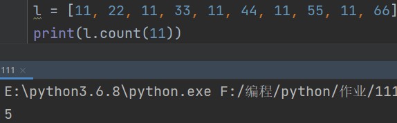 l = [11, 22, 11, 33, 11, 44, 11, 55, 11, 66] print(l.count(11)) # 5
