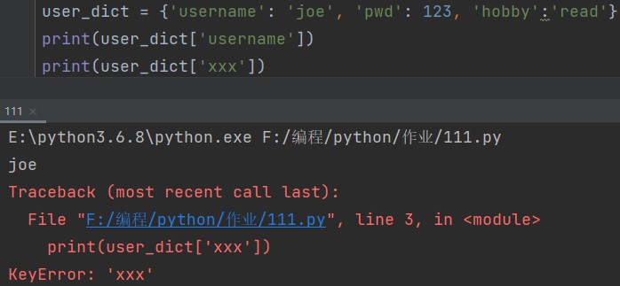 字典['键'] eg: print(user_dict['username']) # joe print(user_dict['xxx']) # 键不存在会直接报错