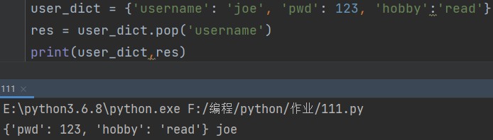 字典.pop(要删除的键) eg: res = user_dict.pop('username') print(user_dict, res) # {'pwd': 123, 'hobby': 'read'} joe