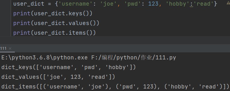 print(user_dict.keys()) # dict_keys(['username', 'pwd', 'hobby']) print(user_dict.values()) # dict_values(['joe', 123, 'read']) print(user_dict.items()) # dict_items([('username', 'joe'), ('pwd', 123), ('hobby', 'read')])