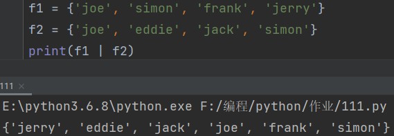 print(f1 | f2) # {'jerry', 'eddie', 'jack', 'joe', 'frank', 'simon'}