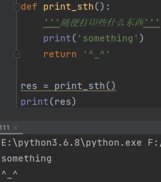 # 函数的语法结构 def 函数名(参数1,参数2): '''函数的注释''' 函数体代码 return 函数的返回值 eg: def print_sth(): '''随便打印些什么东西''' print('something') return '^_^'