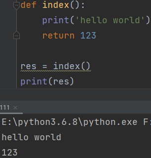 def index(): print('hello world') return 123 res = index() print(res) # 123