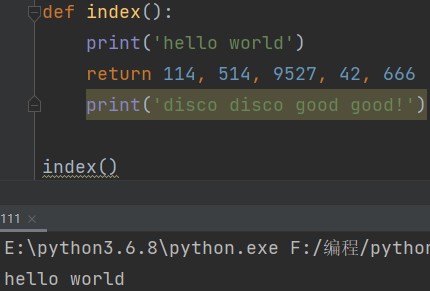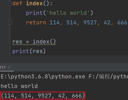 def index(): print('hello world') return 114, 514, 9527, 42, 666 res = index() print(res) # (114, 514, 9527, 42, 666)