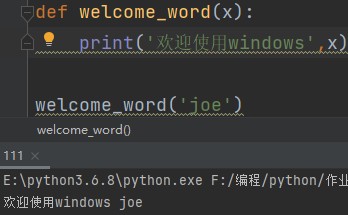 def 函数名(参数): 函数体代码 eg: def welcome_word(x): print('欢迎使用windows', x) welcome_word('joe')