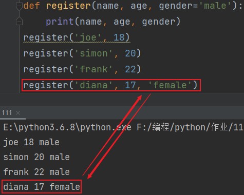 def 函数名(参数1, 参数2, 默认参数1=xxx): 函数需要执行的代码 函数名(参数1, 参数2, 若数据不同于默认参数1时自行赋值) eg: def register(name, age, gender='male'): print(name, age, gender) '''默认参数不给值的情况下就使用默认的 给了就使用给了的''' register('joe', 18) register('simon', 20) register('frank', 22) register('diana', 17, 'female') # 这条登记的是女性,所以要把默认参数修改掉