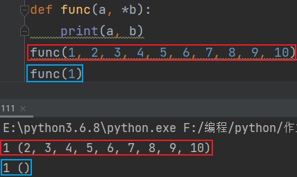 def func(a, *b): print(a, b) func(1, 2, 3, 4, 5, 6, 7, 8, 9, 10) # 1 (2, 3, 4, 5, 6, 7, 8, 9, 10) func(1) # 1 ()