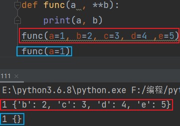 def func(a,**b): print(a,b) func(a=1, b=2, c=3, d=4 ,e=5) # 1 {'b': 2, 'c': 3, 'd': 4, 'e': 5} func(a=1) # 1 {}