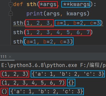 *args # 位置参数 **kwargs # 关键字参数 eg: def sth(*args, **kwargs): print(args, kwargs) sth(1, 2, 3, a=1, b=2, c=3) # (1, 2, 3) {'a': 1, 'b': 2, 'c': 3} sth(1, 2, 3, 4, 5, 6, 7) # (1, 2, 3, 4, 5, 6, 7) {} sth(a=1, b=2, c=3) # () {'a': 1, 'b': 2, 'c': 3}