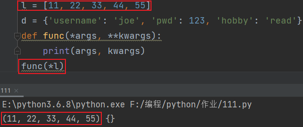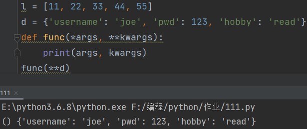 l = [11, 22, 33, 44, 55] d = {'username': 'joe', 'pwd': 123, 'hobby': 'read'} def func(*args, **kwargs): print(args, kwargs)