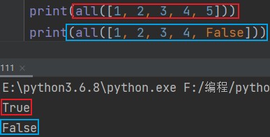 all() eg: print(all([1, 2, 3, 4, 5])) # True print(all([1, 2, 3, 4, False])) # False