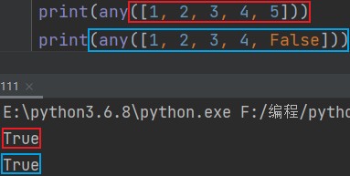 any() eg: print(any([1, 2, 3, 4, 5])) print(any([1, 2, 3, 4, False]))