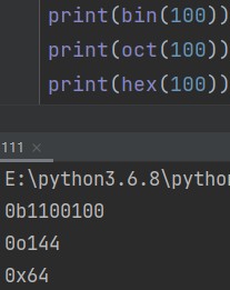 print(bin(100)) print(oct(100)) print(hex(100))
