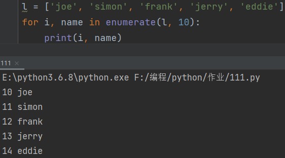 enumerate(列表,起始位) eg: l = ['joe', 'simon', 'frank', 'jerry', 'eddie'] for i, name in enumerate(l, 10): print(i, name)