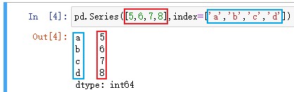 pd.Series([数据1,数据2],index=['索引1','索引2'...]) eg: pd.Series([5,6,7,8],index=['a','b','c','d'])