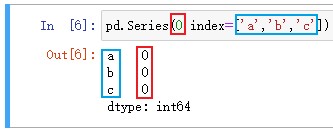 pd.Series(数据,index=['索引1','索引2'...]) eg: pd.Series(0,index=['a','b','c'])