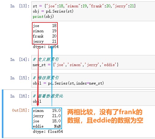 通过关键字index,我们可以自己指定series使用什么字符作为行索引。为了便于区分,我们管数字序号叫行索引,字母或其他字符序号叫行标签。