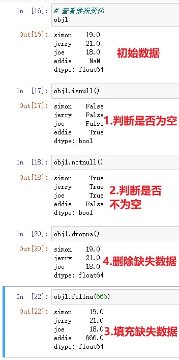 isnull() # 判断数据是否为空,返回布尔数组 notnull() # 判断数据是否不为空(即上一条代码的结果取反),返回布尔数组 fillna() # 填充缺失数据 dropna() # 删除缺失数据
