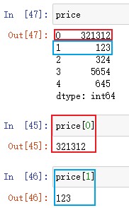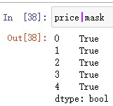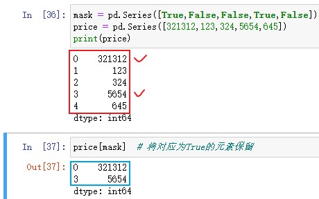 mask = pd.Series([True,False,False,True,False]) price = pd.Series([321312,123,324,5654,645]) price[mask] # 将对应为True的元素保留 """ 0 321312 3 5654 """