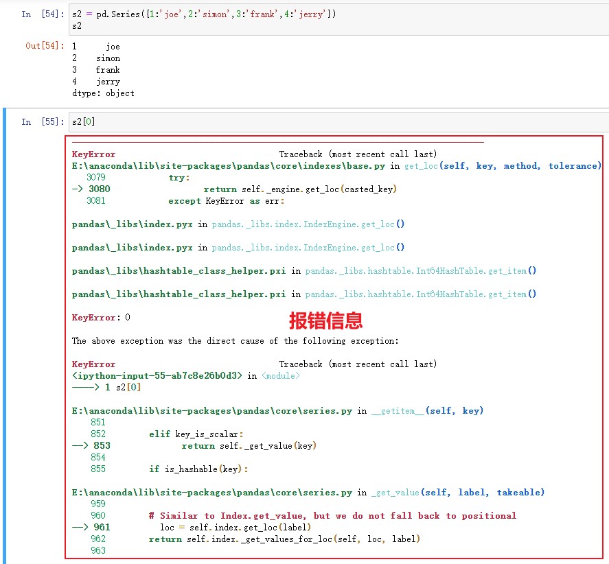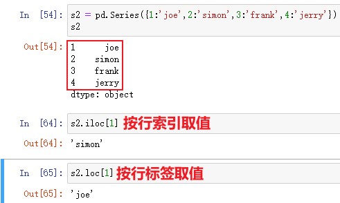 用数字作为行标签的数据名.iloc[行索引] # 按行索引取值 eg: s2.iloc[1] # 'simon' 用数字作为行标签的数据名.loc['行标签'] # 按行标签取值 eg: s2.loc[1] # 'joe'