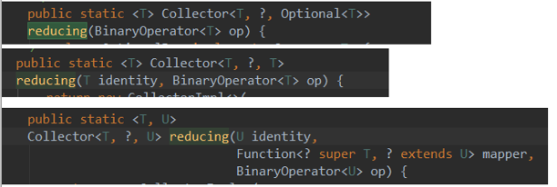 三个重载的collers.reducing方法,第一个是流里面比较,第二个是运行有初始值(但是是返回类型),返回流的类型,第三个是有初始值,还能转换比较对象