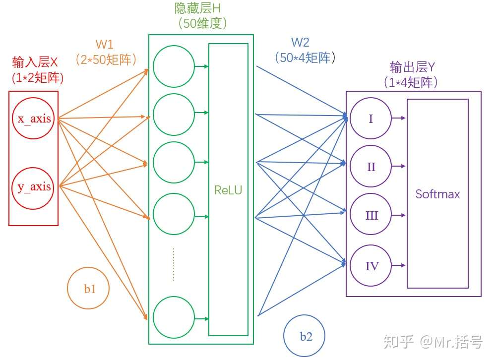 连接输入层和隐藏层的是W1和b1。由X计算得到H十分简单,就是矩阵运算: