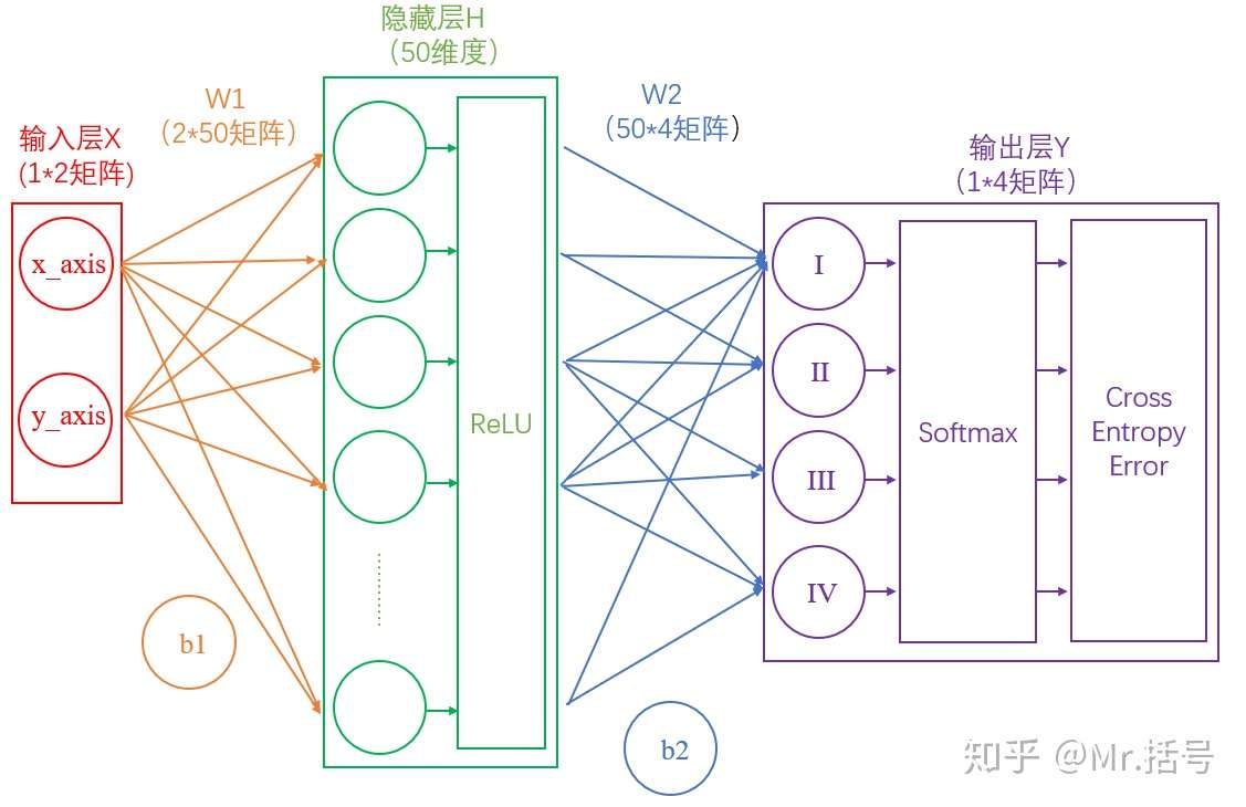 这里我们构建一个两层神经网络,理论上两层神经网络已经可以拟合任意函数。这个神经网络的结构如下图: