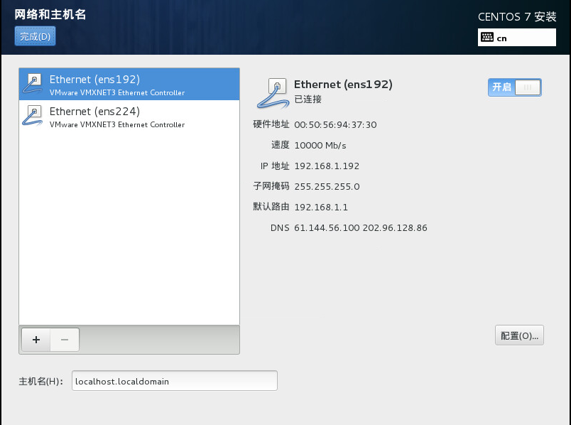 1.5 点击"网络和主机名",进行网络设置,设为“开启”,然后点击“完成”。