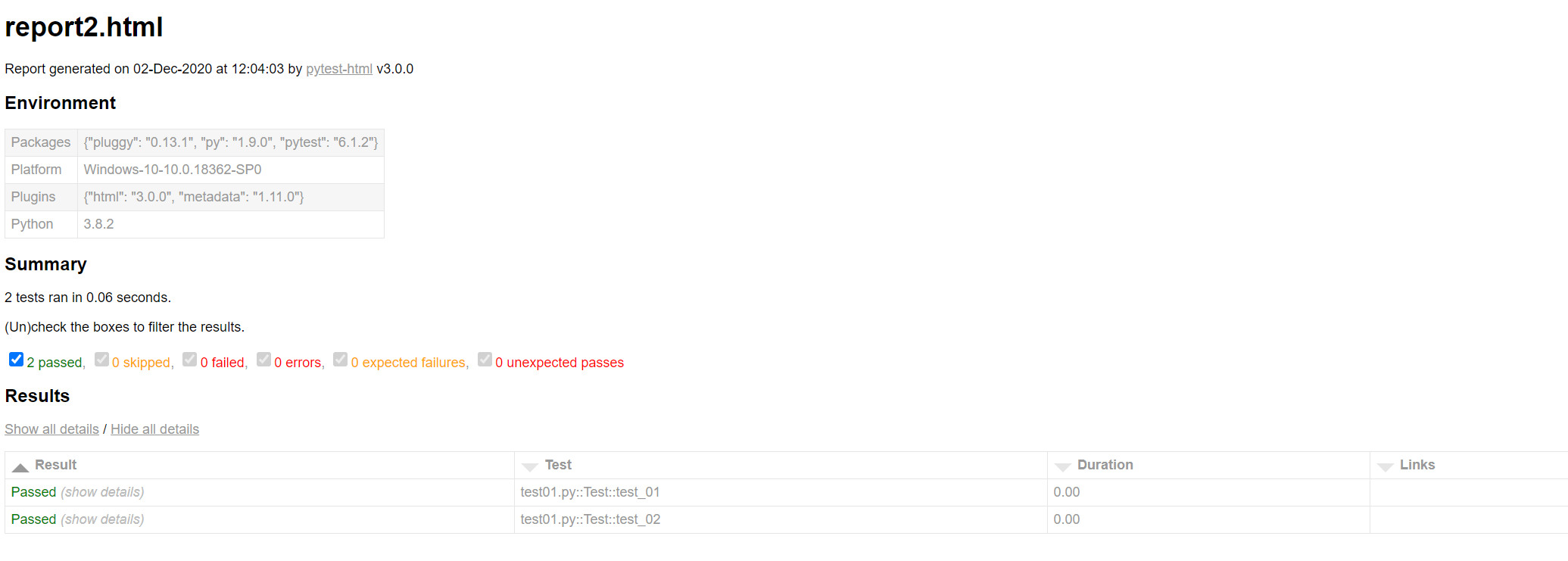 不在脚本中写入参数,也可以在命令行中输入pytest test01.py --html=report.html也可以得到一样效果。只是在脚本上写参数会方便一点