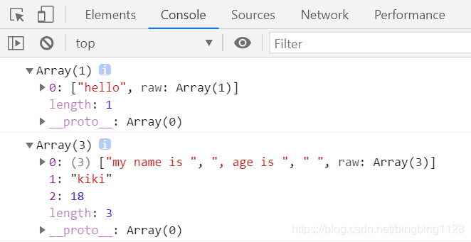 let name = 'kiki', age = 18 function foo(...args){ console.log(args) } foo`hello` foo`my name is ${name}, age is ${age} `