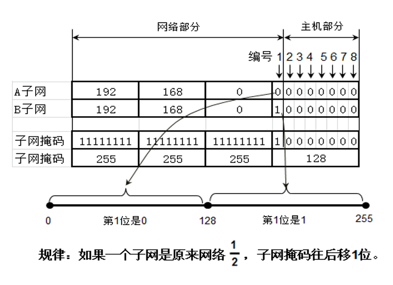 首先来看看 等长子网划分,C类地址的主机部分是8位,可用主机数是 254 个,划分成两个子网,将主机部分划出一位到网络部分,即子网掩码的位数由24位变成25位。
