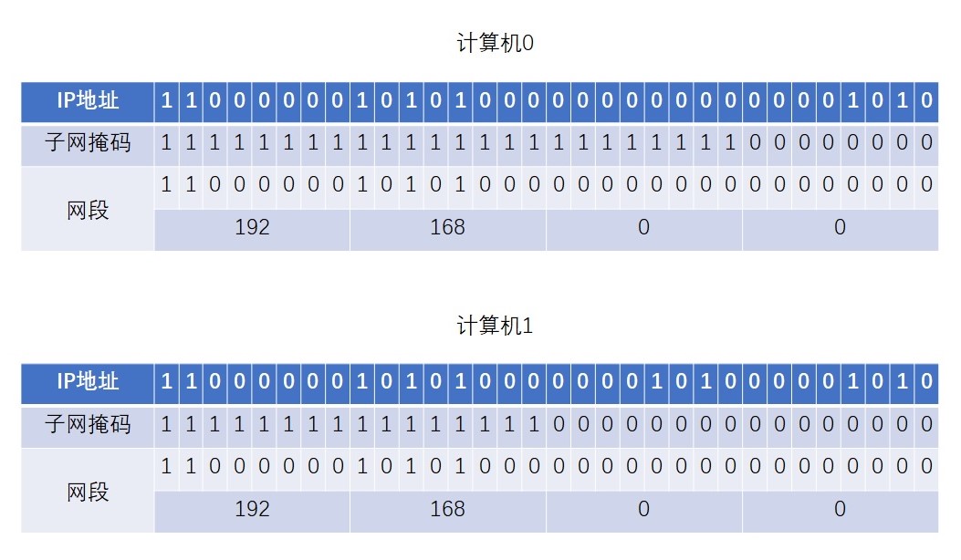 如果计算机1向计算机0发消息,按照计算机1的子网掩码(255.255.0.0)与计算机0的IP地址(192.168.0.10)按位与操作得出计算机0的网段(192.168.0.0),此时虽然发消息时两台机器的网段一致,但是由计算机0回消息给计算机1时,网段仍然会不一致。