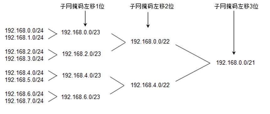 超网与子网相反,是将多个连续的网段合并成更大的网段。