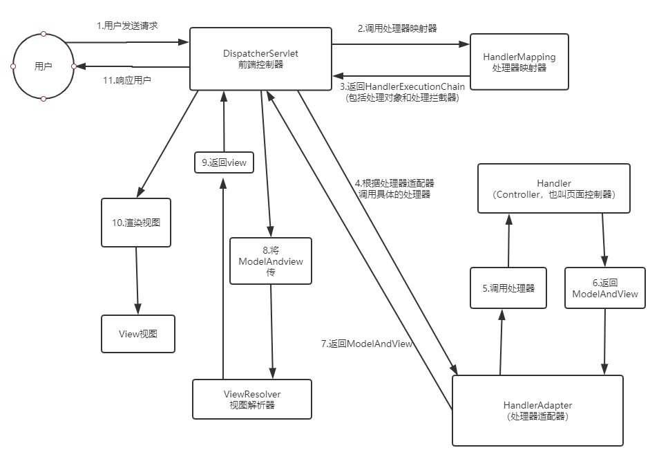- DispatcherServlet将ModelAndView传给ViewResolver视图解析器;