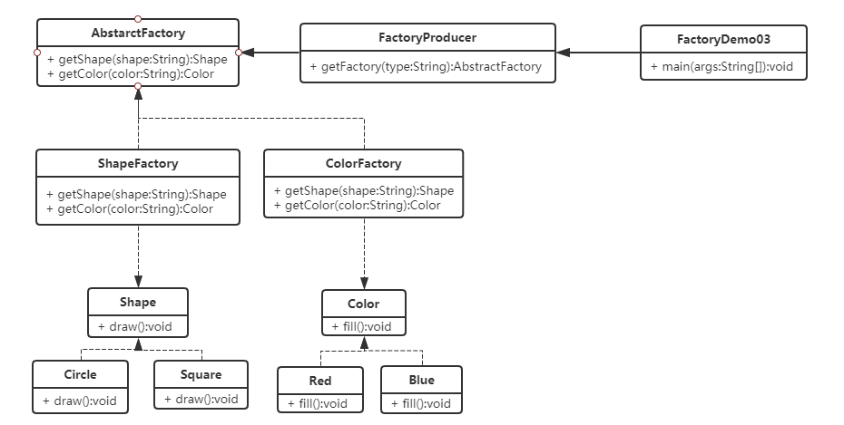 public class FactoryDemo03 { public static void main(String[] args) { AbstractFactory factory = FactoryProducer.getFactory("shape"); factory.getShape("Cicle").draw(); factory = FactoryProducer.getFactory("color"); factory.getColor("Red").fill(); } }