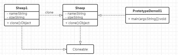 import java.io.Serializable; /** * 原型模式 * 1.继承 Cloneable,重写 clone() * 2.浅克隆---Java Clone实现 * 3.深克隆---实现 Serializable 读取二进制流 * @author yw */ //1.实现Cloneable接口 public class Sheep implements Cloneable,Serializable { private static final long serialVersionUID = 1L; private String name; private Address address; public Sheep(String name, Address address) { this.name = name; this.address = address; } public String getName() { return name; } public void setName(String name) { this.name = name; } public Address getAddress() { return address; } public void setAddress(Address address) { this.address = address; } //2.重写Clone方法 public Object Clone() throws CloneNotSupportedException { return super.clone(); } } import java.io.Serializable; public class Address implements Serializable { private static final long serialVersionUID = 1L; private String cuntry; private String loc; public Address(String cuntry, String loc) { this.cuntry = cuntry; this.loc = loc; } public String getCuntry() { return cuntry; } public void setCuntry(String cuntry) { this.cuntry = cuntry; } public String getLoc() { return loc; } public void setLoc(String loc) { this.loc = loc; } }