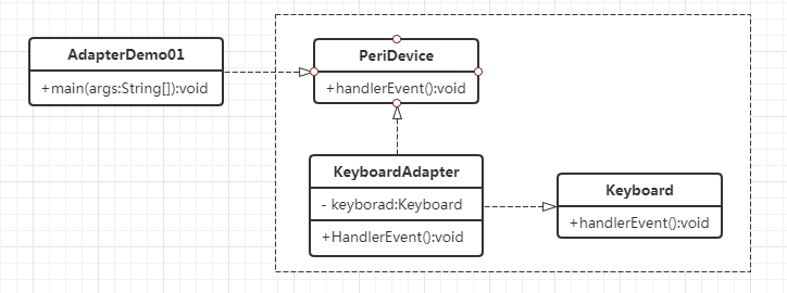 public class AdapterDemo01 { public static void testHandler(PeriDevice pd) { pd.HandlerEvent(); } public static void main(String[] args) { Keyboard kb = new Keyboard();//待适配的对象 PeriDevice pd = new KeyboardAdapter(kb);//适配器 AdapterDemo01.testHandler(pd);//调用者通过适配器进行转接 } }