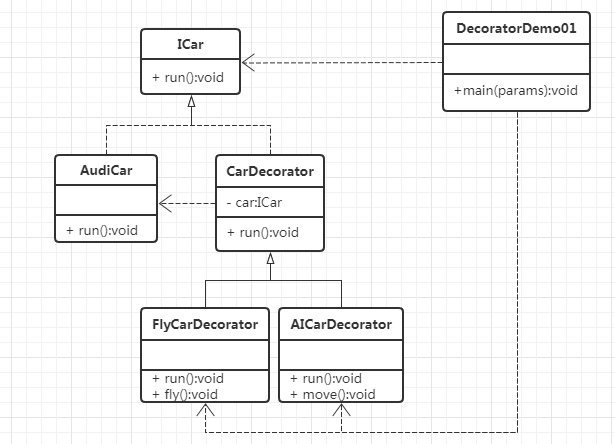 //ConcreteDecorator具体装饰角色 public class AICarDecorator extends CarDecorator { public AICarDecorator(ICar car) { super(car); } public void run() { car.run(); move(); } public void move() { System.out.println("车可以自动驾驶运行!"); } } public class FlyCarDecorator extends CarDecorator { public FlyCarDecorator(ICar car) { super(car); } public void run() { car.run(); fly(); } public void fly() { System.out.println("车可以飞"); } }