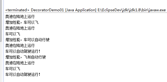 public class DecoratorDemo01 { public static void main(String[] args) { ICar car = new AudiCar(); car.run(); System.out.println("增加性能,车可以飞"); ICar fly = new FlyCarDecorator(car); fly.run(); System.out.println("增加性能,车可以自动行驶"); ICar aiCar = new AICarDecorator(car); aiCar.run(); System.out.println("增加性能,飞和自动行驶"); ICar topCar = new AICarDecorator(fly); topCar.run(); } }
