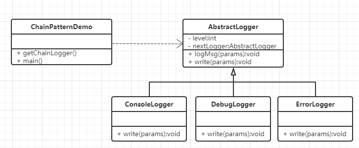 public abstract class AbstractLogger { protected static int INFO = 1; protected static int DEBUG = 2; protected static int ERROR = 3; protected int level ; protected AbstractLogger nextLogger; public void setNextLogger(AbstractLogger nextLogger) { this.nextLogger = nextLogger; } public void logMsg(int level,String msg) { System.out.println("---thisLevel="+this.level+"---level="+level); if(this.level == level) { write(msg); }else { if(nextLogger!=null) { nextLogger.logMsg(level, msg); } } } abstract void write(String msg); }