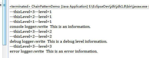 public class ChainPatternDemo { public static AbstractLogger getChainLogger() { AbstractLogger c = new ConsoleLogger(AbstractLogger.INFO); AbstractLogger d = new DebugLogger(AbstractLogger.DEBUG); AbstractLogger e = new ErrorLogger(AbstractLogger.ERROR); e.setNextLogger(d); d.setNextLogger(c); return e; } public static void main(String[] args) { AbstractLogger logger = getChainLogger(); logger.logMsg(AbstractLogger.INFO, "This is an information."); logger.logMsg(AbstractLogger.DEBUG, "This is a debug level information."); logger.logMsg(AbstractLogger.ERROR, "This is an error information."); } }