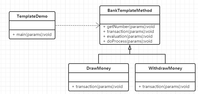 public class DrawMoney extends BankTemplateMethod { @Override public void transaction(String name) { System.out.println(name+"取钱"); } }