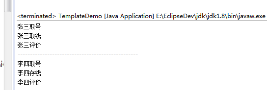 public class TemplateDemo { public static void main(String[] args) { BankTemplateMethod btm = new DrawMoney(); btm.doProcess("张三"); System.out.println("-------------------------------------------------"); btm = new BankTemplateMethod() { @Override public void transaction(String name) { System.out.println(name+"存钱"); } }; btm.doProcess("李四"); } }