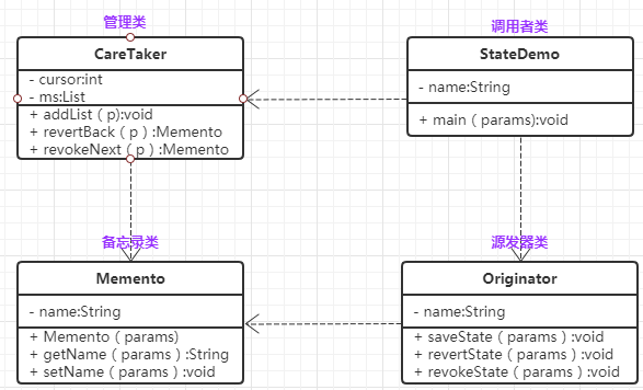 - 3、客户不与备忘录类耦合,与备忘录管理类耦合