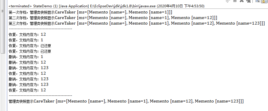 public class StateDemo { public static void main(String[] args) { //初始化源文件 Originator origin = new Originator(); //创建管理快照类 CareTaker ct = new CareTaker(); //第一次往源文件添加内容 origin.setName("1"); //第一次保存快照 ct.addList(origin.saveState()); System.out.println("第一次存档,管理类快照显示"+ct.toString()); //第二次往源文件添加内容 origin.setName("12"); //第二次保存快照 ct.addList(origin.saveState()); System.out.println("第二次存档,管理类快照显示"+ct.toString()); //第三次往源文件添加内容 origin.setName("123"); //第三次保存快照 ct.addList(origin.saveState()); System.out.println("第三次存档,管理类快照显示"+ct.toString()); System.out.println("-------------------------------------------"); origin.revertState(ct.revertBack()); System.out.println("恢复,文档内容为:"+origin.getName()); origin.revertState(ct.revertBack()); System.out.println("恢复,文档内容为:"+origin.getName()); origin.revertState(ct.revertBack()); System.out.println("恢复,文档内容为:"+origin.getName()); origin.revertState(ct.revertBack()); System.out.println("恢复,文档内容为:"+origin.getName()); origin.revokeState(ct.revokeNext()); System.out.println("撤销,文档内容为:"+origin.getName()); origin.revokeState(ct.revokeNext()); System.out.println("撤销,文档内容为:"+origin.getName()); origin.revokeState(ct.revokeNext()); System.out.println("撤销,文档内容为:"+origin.getName()); origin.revertState(ct.revertBack()); System.out.println("恢复,文档内容为:"+origin.getName()); origin.revokeState(ct.revokeNext()); System.out.println("撤销,文档内容为:"+origin.getName()); origin.revokeState(ct.revokeNext()); System.out.println("撤销,文档内容为:"+origin.getName()); origin.revertState(ct.revertBack()); System.out.println("恢复,文档内容为:"+origin.getName()); System.out.println("-------------------------------------------"); System.out.println("管理类快照显示"+ct.toString()); } }