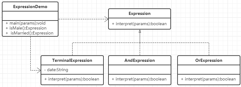 public class TerminalExpression implements Expression { private String date ; public TerminalExpression(String date) { this.date = date; } @Override public boolean interpreter(String Context) { if(Context.contains(date)) { return true; } return false; } } public class AndExpression implements Expression { private Expression e1; private Expression e2; public AndExpression(Expression e1, Expression e2) { this.e1 = e1; this.e2 = e2; } @Override public boolean interpreter(String Context) { return e1.interpreter(Context) && e2.interpreter(Context); } } public class OrExpression implements Expression{ private Expression e1; private Expression e2; public OrExpression(Expression e1, Expression e2) { this.e1 = e1; this.e2 = e2; } @Override public boolean interpreter(String Context) { return e1.interpreter(Context) || e2.interpreter(Context); } }