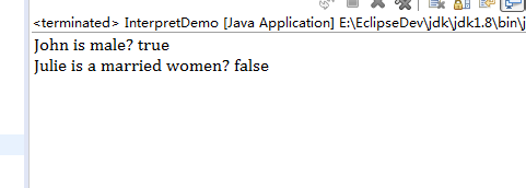 public class InterpretDemo { //规则:Vicent 和 John 是男性 public static Expression isMale() { Expression e1 = new TerminalExpression("Vicent"); Expression e2 = new TerminalExpression("John"); return new OrExpression(e1, e2); } //规则:Forry 是一个已婚的女性 public static Expression isMarried() { Expression e1 = new TerminalExpression("Forry"); Expression e2 = new TerminalExpression("Married"); return new AndExpression(e1, e2); } public static void main(String[] args) { Expression isMale = isMale(); Expression isMarriedWoman = isMarried(); System.out.println("John is male? " + isMale.interpreter("John")); System.out.println("Julie is a married women? " + isMarriedWoman.interpreter("Married Julie")); } }