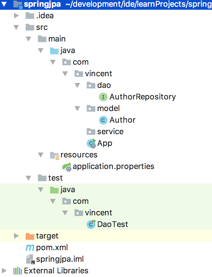 <project xmlns="http://maven.apache.org/POM/4.0.0" xmlns:xsi="http://www.w3.org/2001/XMLSchema-instance" xsi:schemaLocation="http://maven.apache.org/POM/4.0.0 http://maven.apache.org/xsd/maven-4.0.0.xsd"> <modelVersion>4.0.0</modelVersion> <groupId>com.vincent</groupId> <artifactId>springjpa</artifactId> <version>1.0-SNAPSHOT</version> <packaging>jar</packaging> <parent> <groupId>org.springframework.boot</groupId> <artifactId>spring-boot-starter-parent</artifactId> <version>1.5.9.RELEASE</version> <relativePath/> </parent> <name>springjpa</name> <url>http://maven.apache.org</url> <properties> <project.build.sourceEncoding>UTF-8</project.build.sourceEncoding> </properties> <dependencies> <dependency> <groupId>org.springframework.boot</groupId> <artifactId>spring-boot-starter-data-jpa</artifactId> </dependency> <dependency> <groupId>mysql</groupId> <artifactId>mysql-connector-java</artifactId> </dependency> <dependency> <groupId>junit</groupId> <artifactId>junit</artifactId> <version>4.12</version> <scope>test</scope> </dependency> <dependency> <groupId>org.springframework.boot</groupId> <artifactId>spring-boot-test</artifactId> <scope>test</scope> </dependency> <dependency> <groupId>org.springframework</groupId> <artifactId>spring-test</artifactId> <scope>test</scope> </dependency> </dependencies> </project>